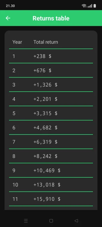 Uygulama, hesaplamaları doğru tutmak için USD, EUR ve GBP için yıl yıl ayrıntılı ve gerçek zamanlı döviz dönüşümü özelliklerine sahiptir. Ayrıca aydınlık ve karanlık modlar arasında geçiş yapabilirken birçok desteklenen dil arasında da geçiş yapabilirsiniz. Bu rakamların sadece eğitim amaçlı tahminler olduğunu ve belirli piyasa dalgalanmalarını veya profesyonel finansal tavsiyeleri dikkate almadığını unutmayın.